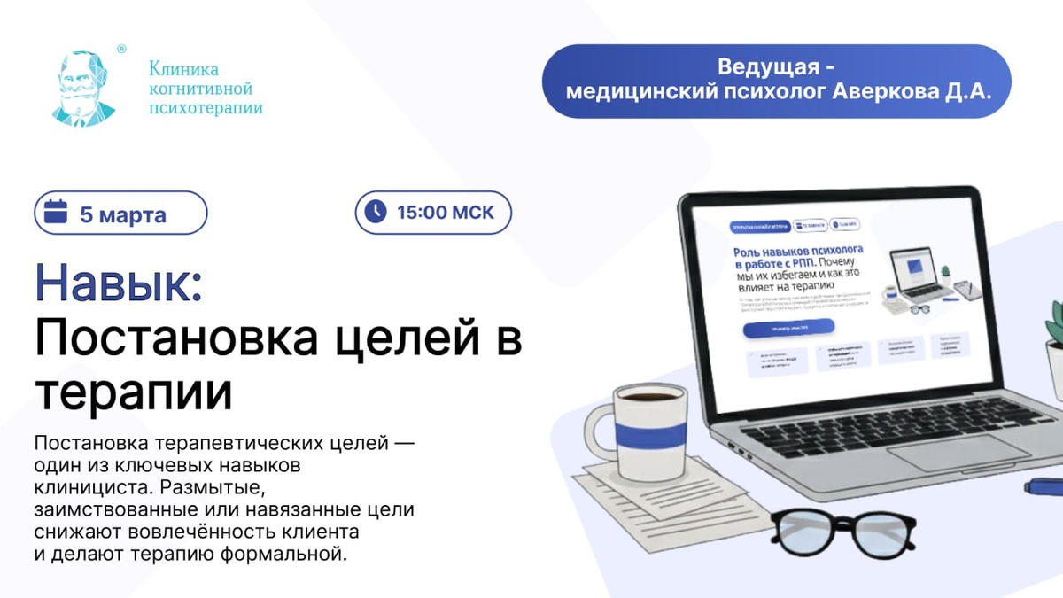 Навык: Постановка целей в терапии 5 марта Онлайн с 15:00 до 18:00 по МСК Ведущий - медицинский психолог Аверкова Д.А. Стоимость 4 000 р. Регистрация https://cbtclinic.education/practikum-ed 🎥 Прямой эфир "Роль навыков психолога в работе с РПП" от ведущих практикума РПП Аверковой Д.А. и Коротиной М.Ю.