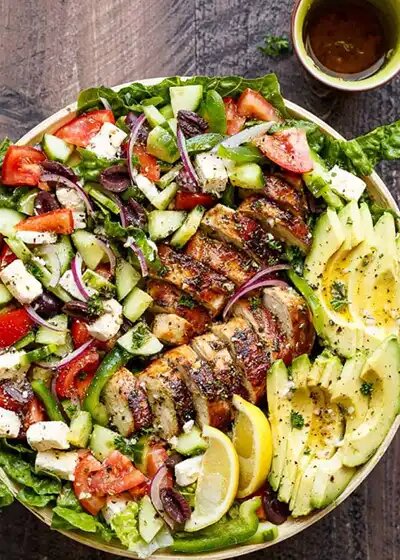 Греческий салат с курицей - еще одно блюдо, которое никогда не разочаровывает. В нем сочетаются средиземноморские вкусы, сочная курица, приготовленная на гриле, сливочный авокадо и все яркие ингредиенты, которые вы ожидаете увидеть в классическом греческом салате, только в лучшем исполнении. Вот рецепт греческого салата. Для приготовления нам будут нужные вот эти продукты:
