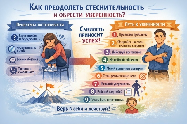 Людям с выраженной стеснительностью свойственны нерешительность и страх публичных выступлений. В сложных ситуациях им трудно подобрать слова, они могут краснеть, терять самообладание, ощущать дрожь в теле. Психологи отмечают, что особенно склонны к застенчивости те, кто боится ошибок и неудач. Такие люди часто сомневаются — как в себе, так и в окружающих.