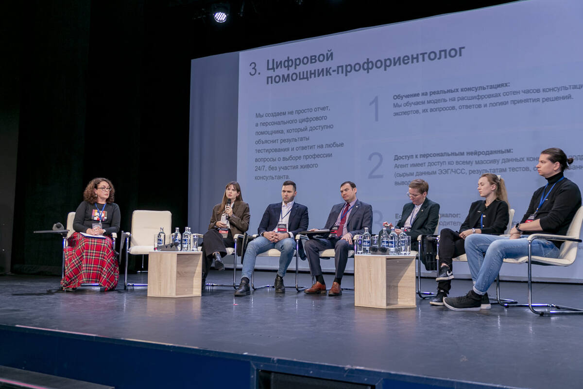 Наталья Галкина подняла вопрос об этических границах применения нейротехнологий в образовательном процессе, Кристина Кудрявцева подробно рассказала о прикладных сценариях нейро-профориентации и внедрении искусственного интеллекта в продукт.