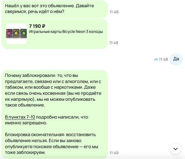 На Авито публикуюсь давно, и иногда сталкиваюсь с блокировками, но этот момент удивил своим продолжением, даже после снятия блокировки. Объявление «игральные карты Bicycle Neon 3 колоды» - это игральные карты, с описанием, где присутствует слова Neon и Pantone. Первое это название карт, а второе это краска, используемая в полиграфии этих же карт. Полное описание вы можете посмотреть и на Авито, так как объявление я не снимал, хотя теперь уже думаю снять, а то мало ли что мне еще заблокируют или ограничат. С блокировкой я толкнулся 23 января, когда опубликовал объявление. Причина – по мнению Авито есть пропаганда (можете на фото посмотреть, чего). Блокировка окончательная, с угрозой того, что, если что мне еще заблокируют объявление при перевыставлении. К чести сотрудника Авито, в описание вчитались, и блокировку сняли. Однако… С 2 февраля, покупатель не мог заказать у меня товар через службу 5Post – как выяснилось, у меня ограничение на отправку. Почему? Опять же из-за объявления «игр