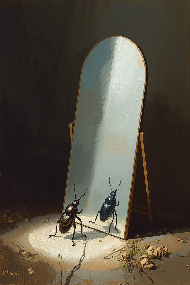 Я — Майский жук. И сегодня свершилась Судьба. Я увидел себя в зеркале. Сначала — испуг. Потом — прозрение. Кто мог подумать! Я — Великан. Великий Жук. И я — пошёл. Не творить дела. А смотреть — как на меня смотрят. И что же? Муравьи принимают меня за холм. Птицы, пролетая, не замечают. Я — не событие. Я — просто помеха на пути. Большой Болван. Рассчитывал на дорожку из мёда, а получил — равнодушие размером с небо. Будь проклято зеркало, показавшее мне сказку! Что это? Тьма. Тишина. Я кричу — и слышу только своё шипение. Я ослеп? Оглох? Или это и есть мир без отражения? Но в этой тьме... Я что-то чувствую. Незнакомое. Тёплое. Я что-то вижу. В темноте. Себя. Снова в зеркале. Но зеркало теперь — не передо мной. Оно — во мне. Ага. Так вот для чего... Отражение Великана — не для мира. Оно — для Узнавания. Для шёпота, а не для шума. Не корона для вселенной. А — ключ. Корень. Живой свет в собственной броне. Я — Великий Жук. Но «Великий» — не значит «важный для всех». «Великий»— значит «целый