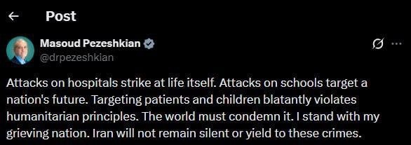 : Нападения на больницы — это удар по самой жизни. Нападения на школы — это удар по будущему нации. Нападения на пациентов и детей — это вопиющее нарушение гуманитарных принципов. Мир должен осудить это. Я сочувствую своей скорбящей нации. Иран не будет молчать и не потерпит этих преступлений. Сальное Дифлопэ