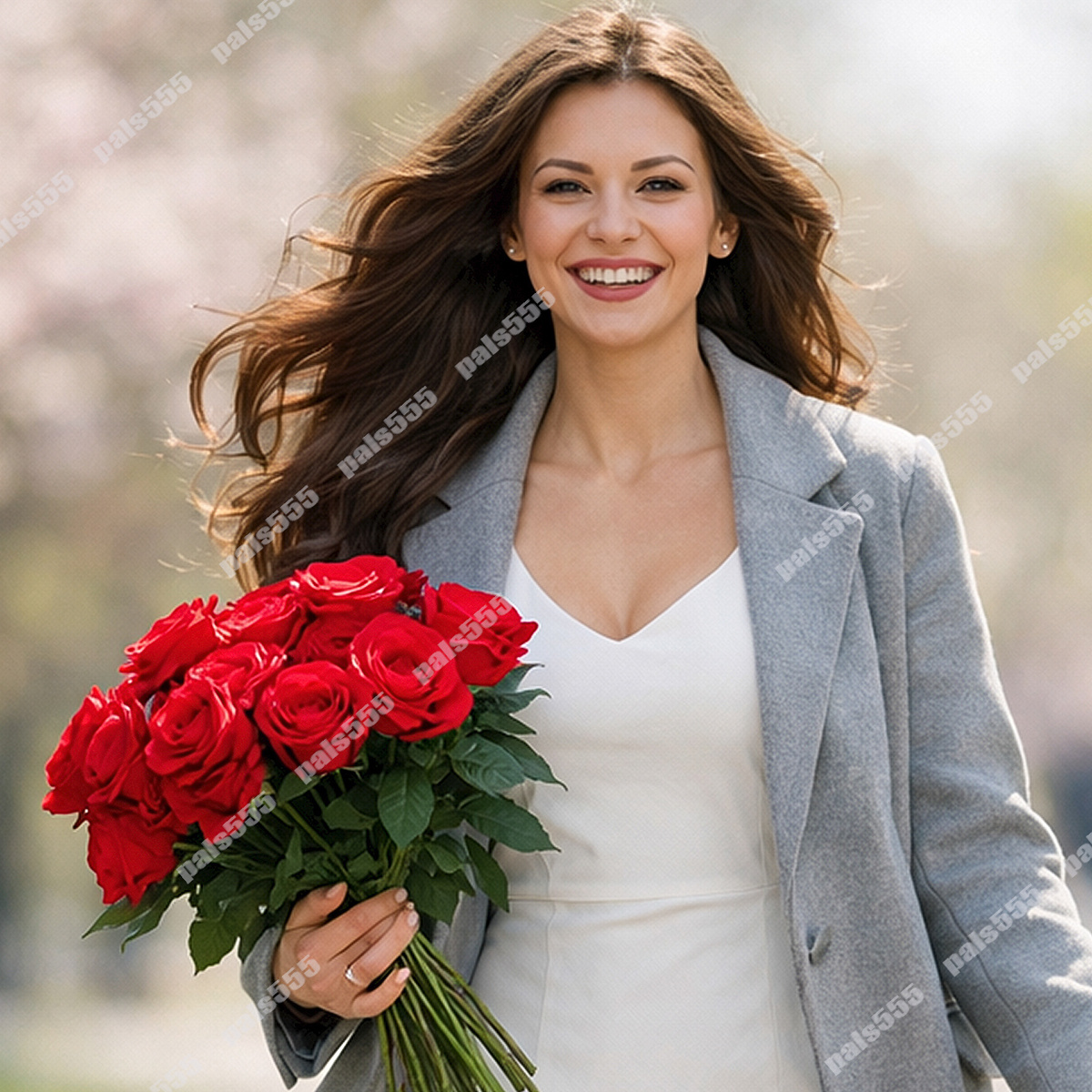 с букетом алых роз и сиянием в глазах.