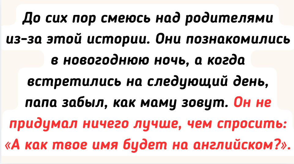 - До сих пор смеюсь над родителями из-за этой истории. Они познакомились в новогоднюю ночь, а когда встретились на следующий день, папа забыл, как маму зовут. Он не придумал ничего лучше, чем спросить: «А как твое имя будет на английском?». Мама посмотрела на него очень странно, но ответила: «Так же, Лена». © sergeivikhanov
