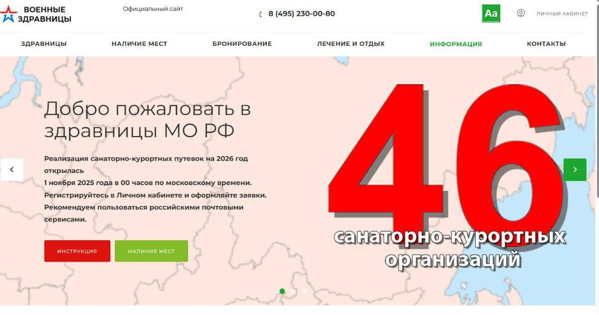 Приём заявок на оформление путёвок в военные санатории на 2026 год открыт на официальном сайте «Военные здравницы». Обновлённый портал стал более удобным: в меню появился раздел «наличие мест», где теперь можно в реальном времени увидеть количество свободных мест в каждом санатории. Кроме того, пользователи могут оставить заявку даже при отсутствии свободных мест — она будет учтена при открытии новых квот. С ноября 2025 года началась реализация путёвок в санаторно‑курортные организации Министерства обороны Российской Федерации на период заездов с 1 января по 31 декабря 2026 года. 🇷🇺 1430 гв полк в MAX Подписаться | Связаться с полком Служить в полку