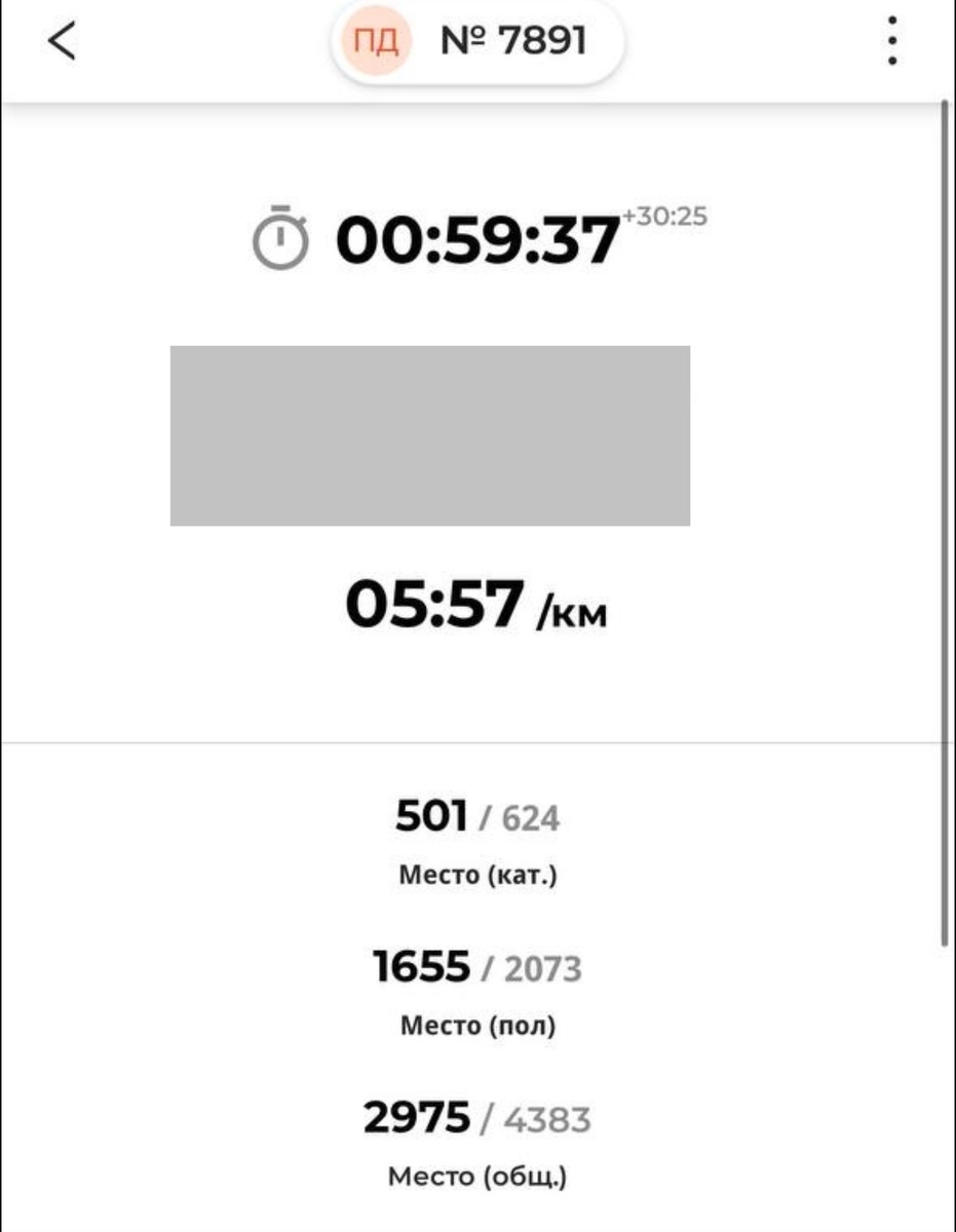 59:37. Я не верил. Смотрел на часы и не верил. План был выбежать из 1:10 — просто чтобы не опозориться. А тут 59:37. Темп 5:57.