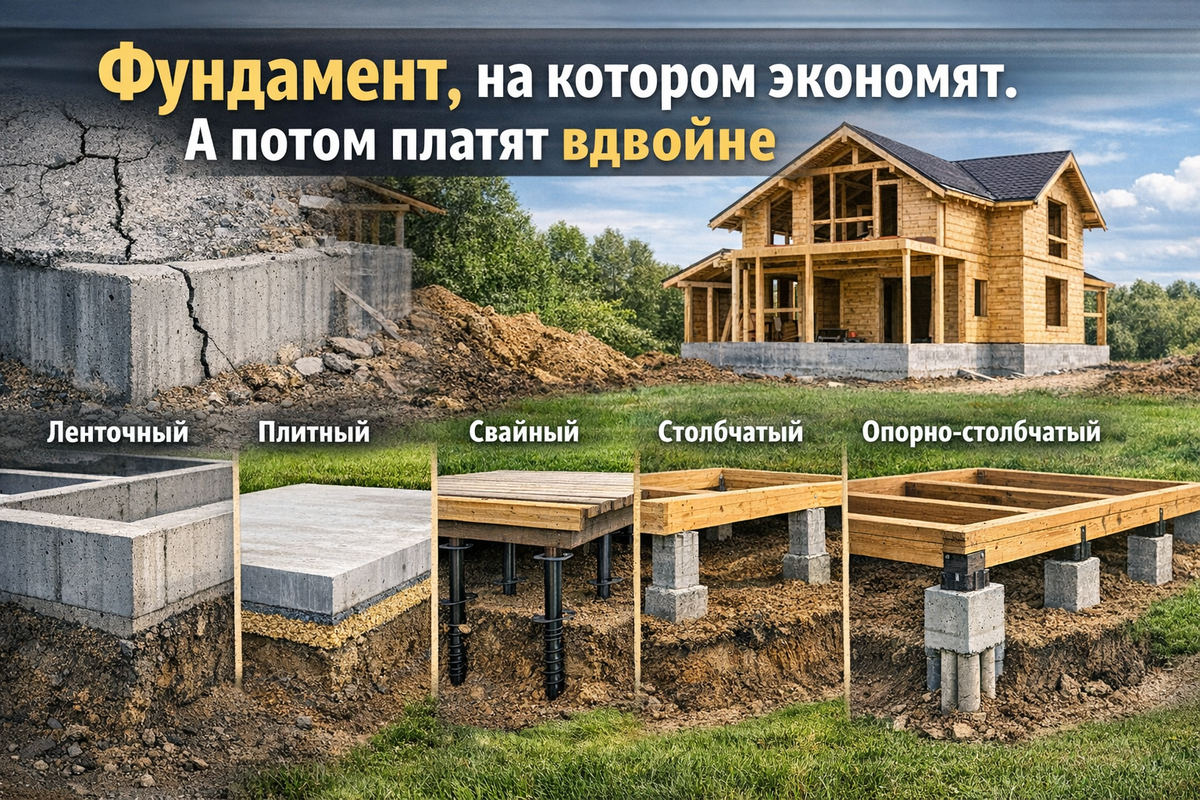 Если дом дал трещину – проблема почти всегда не в стенах. Она в фундаменте. За 25 лет работы в ИЖС мы видели десятки ситуаций, когда люди выбирали основание «по совету соседа» или потому что «так дешевле на 300 тысяч». Через 2–3 года начинались перекосы дверей, трещины в отделке, просадки пола. Переделка фундамента — одна из самых дорогих операций в строительстве. Поэтому главный вопрос нужно задать не «какой фундамент дешевле», а «какой подходит именно моему участку». В малоэтажном строительстве применяют пять основных типов: – ленточный