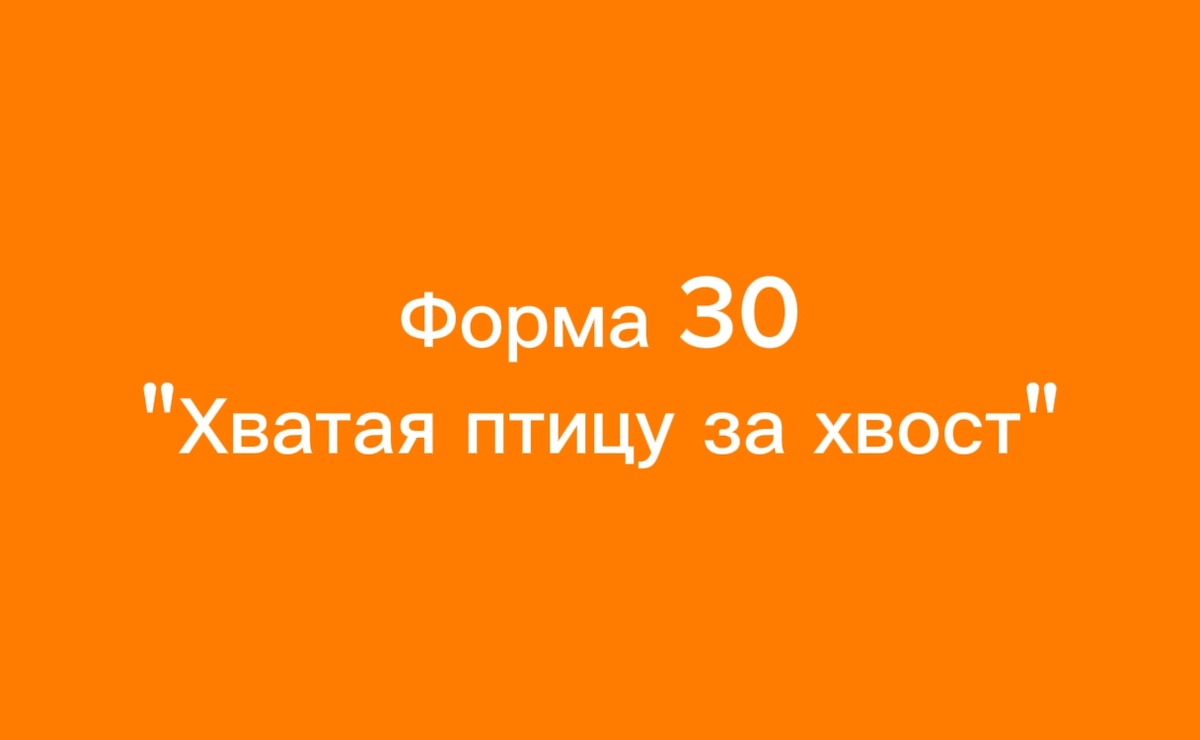 Конечное положение формы 30. Вы удерживаете вес на согнутой правой ноге лицом на северо-восток. Левая нога свободная от веса выпрямлена легко касается пола, носок левой ноги направлен на восток, линии ступней в этом положении не параллельны, они под углом 45°. Правая рука прямая вытянута на северо-восток, кисть захватывает большой палец. Левая рука ладонью к лицу с пальцами у правого пульса. Правое запястье на уровне глаз. Это Исходное положение формы 31.