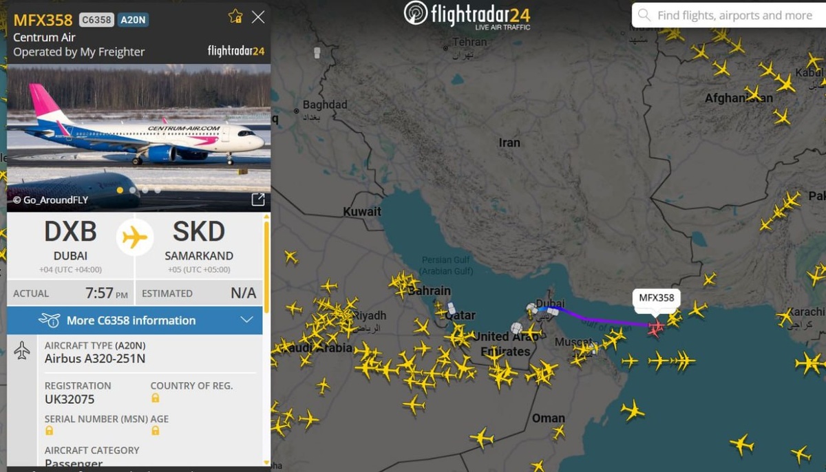 Первый за последние дни рейс из аэропорта Дубая вылетел. Борт узбекской Centrum Air направляется в Самарканд.