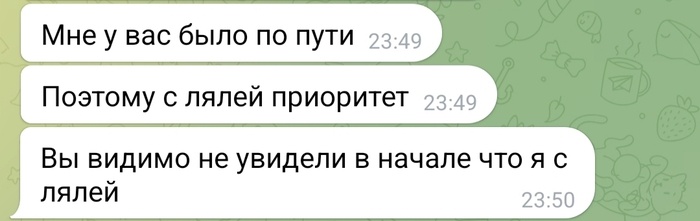Я работаю логопедом -дефектологом. Арендую маленький кабинет в творческом офисе. Недавно пишет одна клиентка с просьбой взять её ребёнка на занятия. Объявляет желаемые дни и время На что я ей отвечаю, что есть свободный только один день, остальное сидеть и ждать отмен занятий (допустим, по здоровью клиента). *Упоминает, что у неё ещё ляля. На что дама просит воскресенье. А это у меня единственный выходной. Я отказала. *Снова про лялю. Дальше, начинается та же шарманка. Пишет про дни и время (на которые я дала ей ответ ранее). И тут от неё прилетает "жёсткий", серьезный аргумент... Я, конечно, знатно кхмм...охренела от наглости. За 15 лет работы впервые такое вижу. Я ответила ей ласково, что клиентов с лялями у меня много. Свободное время выдаётся по возможности, а не по приоритету. На что дама прочитала и не ответила. Видимо, была она опосромлена до глубины души. Всем спасибо. Пост автора HappyMamaMia. Читать комментарии на Пикабу.
