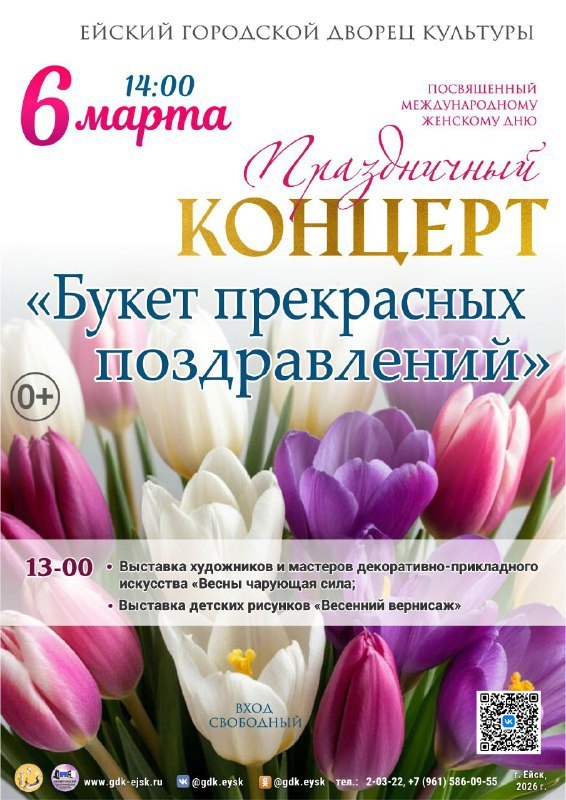 «Букет прекрасных поздравлений», посвящённую Международному женскому дню 🩷 Вход свободный. Перед началом программы в фойе вас ждут: — выставка художников и мастеров декоративно-прикладного искусства «Весны чарующая сила»; — выставка детских рисунков «Весенний вернисаж». 🚀 Подписывайтесь: @gdk_ejsk