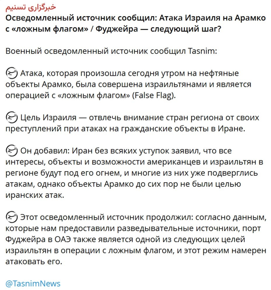 Иранские СМИ заявляют, что атака на нефтяную инфраструктуру Саудовской Аравии - операция Израиля "под ложным флагом".