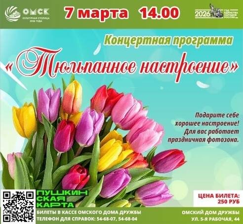 Концертная программа с песнями и стихами о весне и любви в честь женского праздника. Выступят творческие коллективы и солисты Омского Дома Дружбы и национально-культурных объединений региона. В фойе будет работать праздничная фотозона. Начало: 07 марта 2026 14:00 Стоимость: 250.0 руб. Адрес: г Омск, 5-я Рабочая, 44 Организатор: https://vk.com/public197884604 Доброе утро, культурная столица! В канун самого нежного весеннего праздника — дня добра, света, жизни и любви — Омский Дом Дружбы приглашает вас на праздничную концертную программу. Вас ждет насыщенная программа, наполненная номерами, адресованными самой прекрасной половине человечества — женщинам! Со сцены прозвучат замечательные песни и стихи о весне и любви. Для вас выступят лучшие творческие... #общество_традиции Узнать подробности, адрес или записаться на событие.