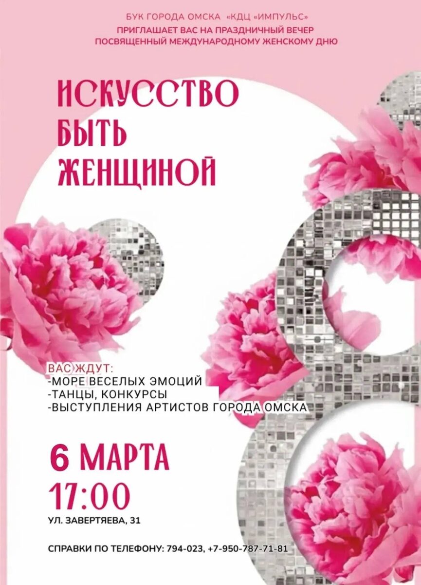 Праздничный вечер для женщин и тех, кто ценит их красоту и силу. Вас ждут море позитива, весёлые эмоции, танцевальные паузы, интерактивы и яркие выступления талантливых артистов. Начало: 06 марта 2026 17:00 Стоимость: 200.0 руб. Адрес: г Омск, Завертяева, 31 Организатор: https://vk.com/public200595327 🌸 Встречаем весну ярко! 🌸 Дорогие дамы, а также те, кто ценит и восхищается их красотой и силой! Культурно-досуговый центр “Импульс” с радостью приглашает вас на праздничный вечер “Искусство быть женщиной”! Время: 6 марта, 17:00 Место: КДЦ “Импульс”, ул. Завертяева, 31 🌟Что Вас ждёт? - Море позитива и весёлых эмоций; - Танцевальные паузы, интерактивы! - Яркие выступления наших талантливых артистов! Цена билета: 200... #развлечения_современная_музыка #развлечения_игры_и_конкурсы Узнать подробности, адрес или записаться на событие.
