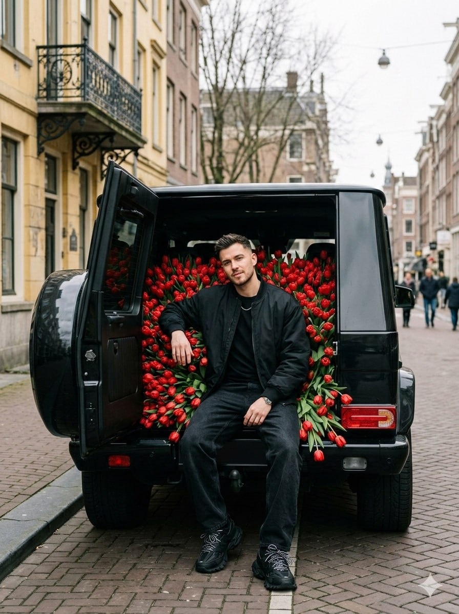 Хотели бы такой сюрприз? Лайк - хотели. Сердечко - я мужчина :) **Стиль и Фотореализм** * Высококачественное фотореалистичное fashion-фото. * Максимальный реализм и детализация. * Естественное, легкое пленочное зерно, без эффектов HDR и AI-look. **Внешность (Строгое соответствие)** * Лицо, черты лица, пропорции, возраст и натуральная текстура кожи должны быть 1:1 перенесены с загруженного эталонного фото. * Загруженное фото — единственный и строгий эталон внешности. * Никакие новые черты не добавляются, только перенос существующей внешности. **Образ и Одежда** * Уверенный, расслабленный мужской образ в стиле total black оверсайз. * Черный оверсайз бомбер. * Черная футболка. * Свободные черные джинсы. * Массивные черные кроссовки. **Поза и Композиция** * Человек сидит на краю открытого багажника черного Mercedes-Benz G-Class без номерных знаков. * Поза уверенная, расслабленная. * Корпус слегка отклонен назад, спина опирается о рамку багажника. * Вертикальный формат кадра 3:4. *