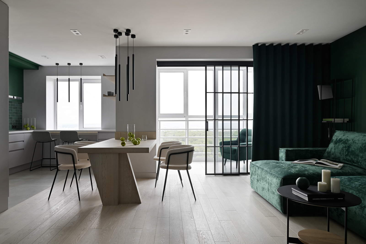 Пожелания заказчиков были конкретными: лаконичный интерьер с бюджетными решениями и материалами, выдержанный в глубоком зелёном — любимом цвете хозяйки. «Этот оттенок стал не просто капризом, а логичным продолжением вида за окном, — поясняет автор проекта. — Мы использовали его как акцент, а дополнительные нейтральные оттенки, текстура дерева на полу и обилие света символически связали интерьер с окружающим парковым лесом».