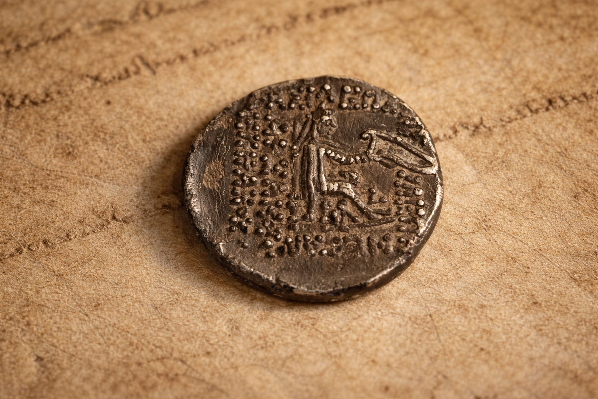 Но сначала давайте перевернём монету. На реверсе - самое интересное. Сидит фигура в восточных одеждах, в руке лук. Классический парфянский образ: царь-лучник. Лук здесь не для красоты - это символ военной мощи. Те самые конные стрелки, от которых римские легионеры в ужасе разбегались.