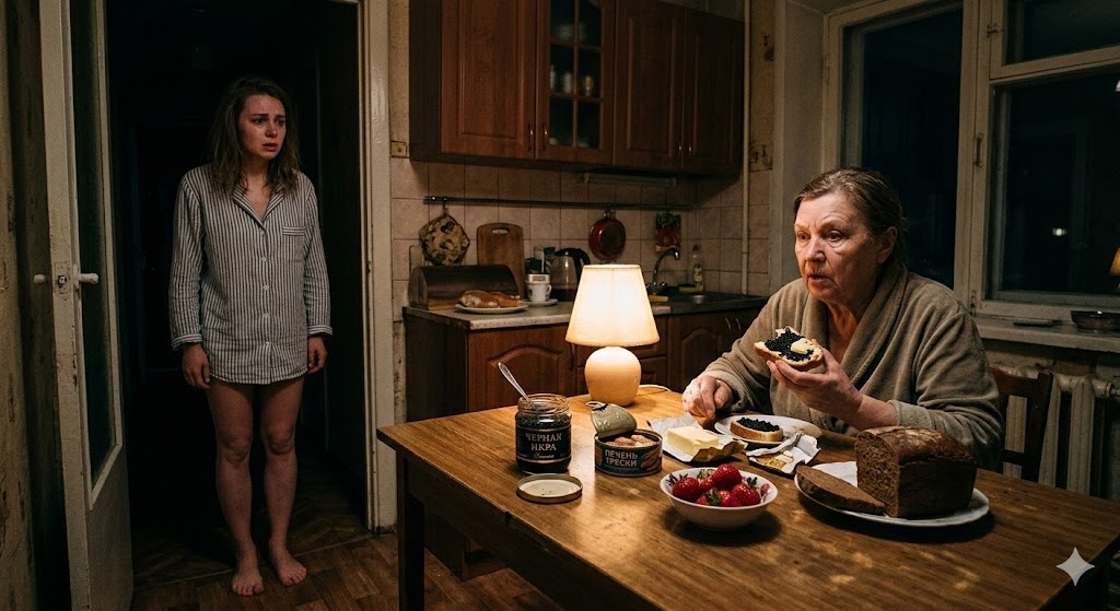 В ту секунду время в кухне замерло, превратившись в густой, липкий кисель. Свет единственной лампочки над столом казался ослепительным прожектором, выхватившим преступницу на месте действия. Антонина Петровна замерла с поднесенным ко рту бутербродом. Икра поблескивала на свету, словно россыпь черного жемчуга.