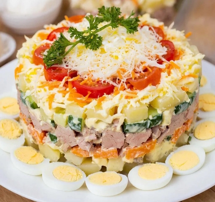 Этот вариант салата получается легким и освежающим благодаря свежим овощам. Подавайте салат «Екатерина» холодным, наслаждаясь гармоничностью вкусов.