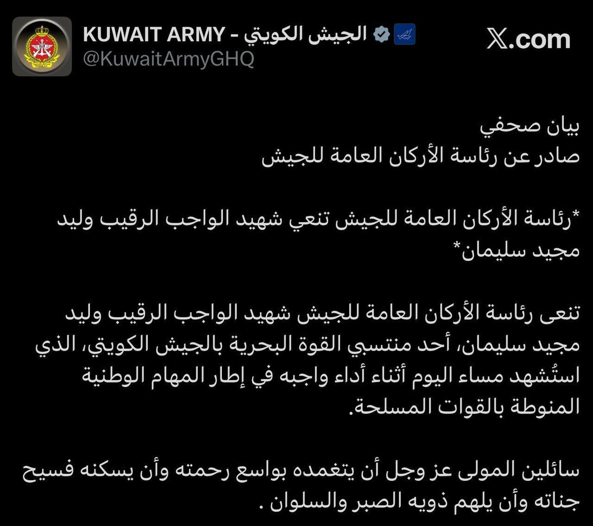 Այսօր զոհվել է Քուվեյթի զինվոր իր ծառայությունը կատարելիս