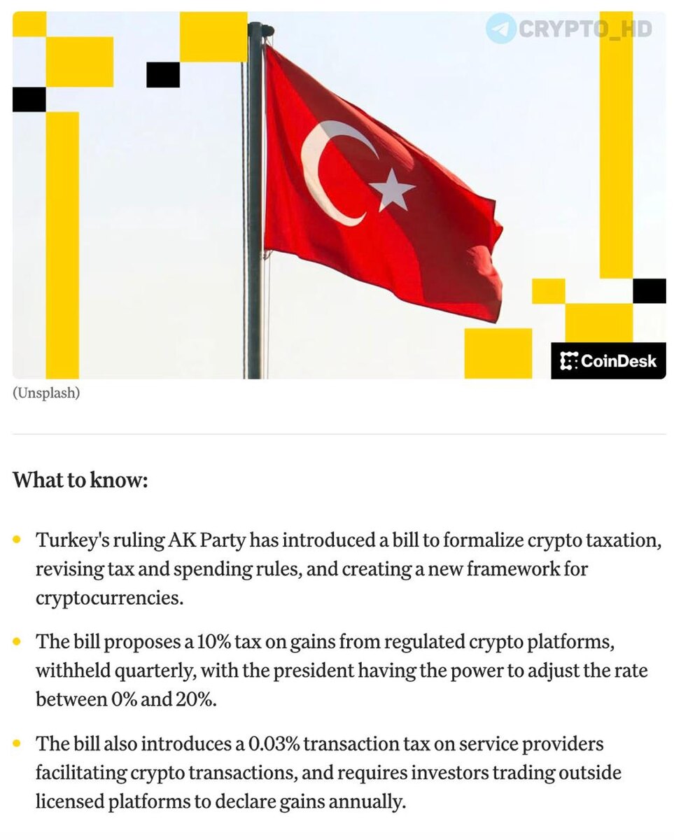 Правящая партия AKP внесла в парламент законопроект о налогообложении криптоактивов. Регулируемые платформы должны удерживать 10% с доходов клиентов ежеквартально – неважно, физлицо это или компания, резидент или нет. Президент получит право менять ставку от 0% до 20% в зависимости от типа токена, срока владения и вида кошелька. Для провайдеров – отдельный налог 0,03% от суммы операции. Crypto Headlines