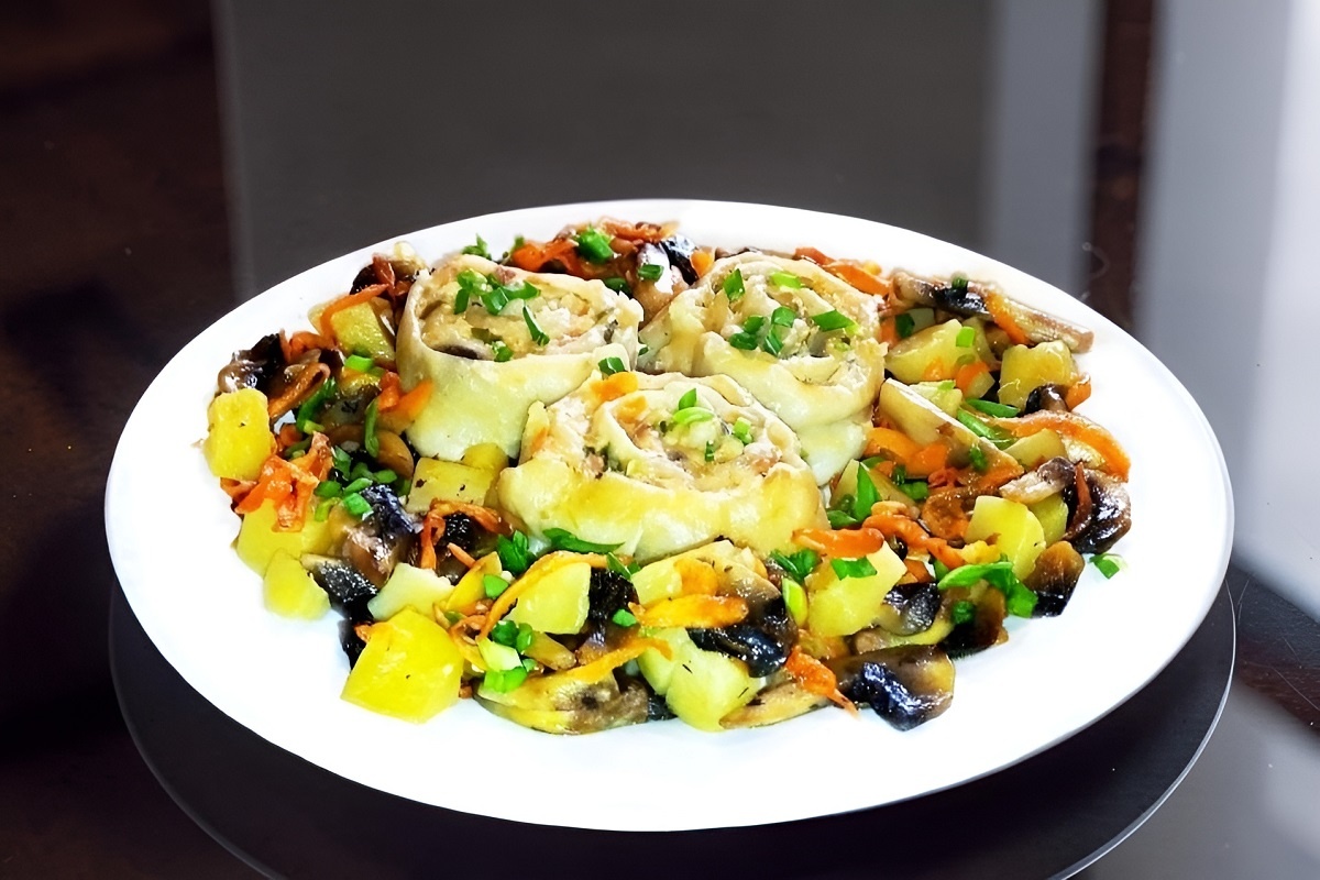 Теперь отделяем картофель от мясных рулетиков, добавляем к нему грибы, перемешиваем и раскладываем по порционным тарелкам. А сверху кладём наши штрули, посыпаем свежей зеленью и подаём: