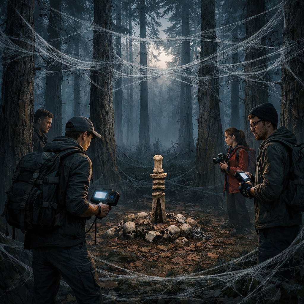 Перед ними открылось «паутинное кольцо»: двенадцать сосен, стянутых мертвенно-белой сетью, вязальной, но липкой, будто грибница решила сплести силок. В центре лежал костяной пряслиц — бусина-тотем с отверстиями, слегка проворачивавшаяся на ветру, словно примеряя звук.
