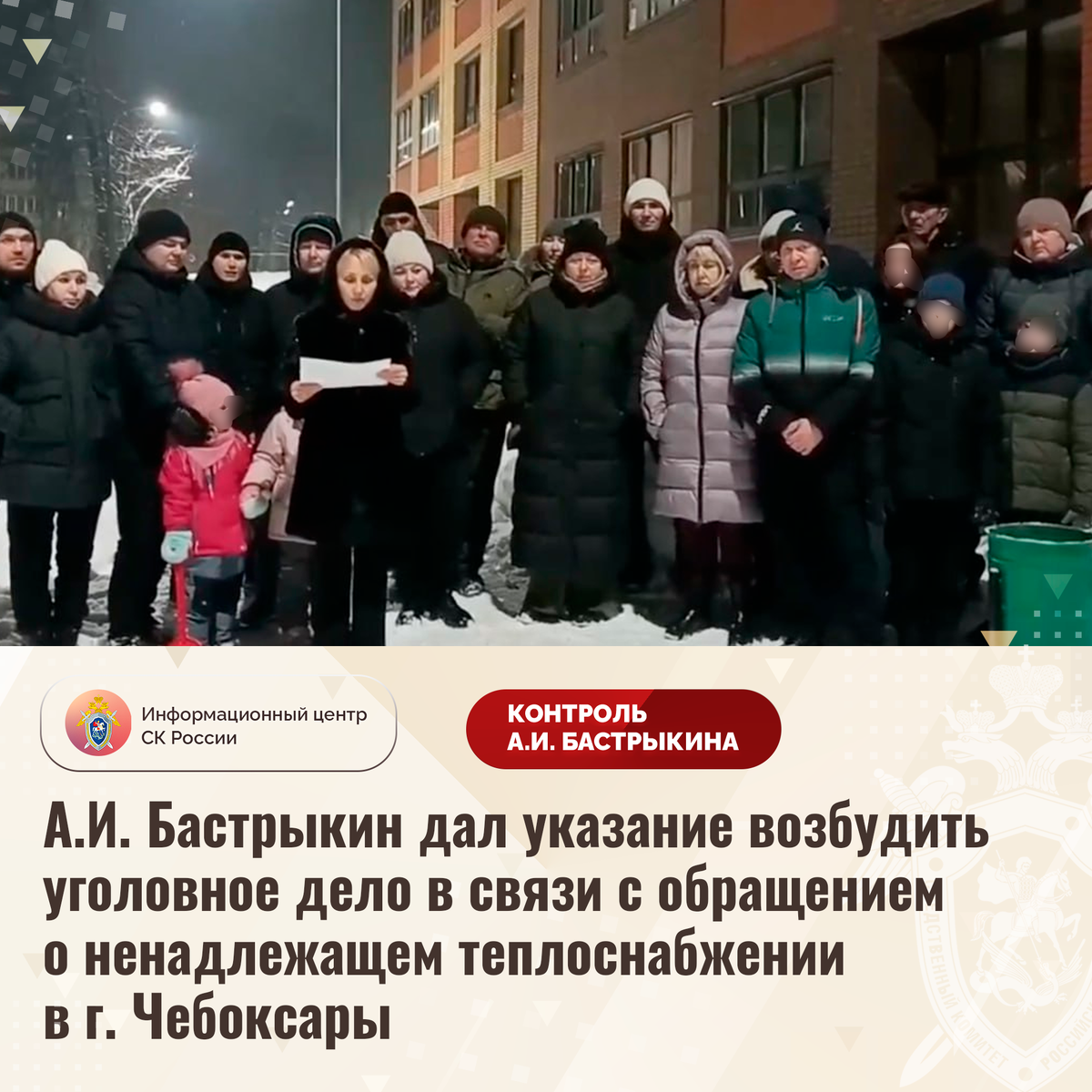 А.И. Бастрыкин дал указание возбудить уголовное дело в связи с обращением о ненадлежащем теплоснабжении в г. Чебоксары В сети Интернет размещено видеообращение к Председателю СК России А.И. Бастрыкину жильцов многоквартирного дома на улице Бичурина города Чебоксары по вопросу нарушения их прав на качественное теплоснабжение. Здание введено в эксплуатацию застройщиком в 2022 году. Однако из-за нарушений, допущенных при установке отопительной системы, и отсутствия автоматического блока регулирования температур коммунальный ресурс подается в жилые помещения не в полном объеме, что приводит к промерзанию стен. Обращения в различные инстанции результатов не принесли, ремонтные работы не осуществляются. В СУ СК России по Чувашской Республике организована процессуальная проверка. Председатель Следственного комитета Российской Федерации Александр Иванович Бастрыкин дал указание и.о. руководителя СУ СК России по Чувашской Республике Максиму Юрьевичу Федорову возбудить уголовное дело и представ