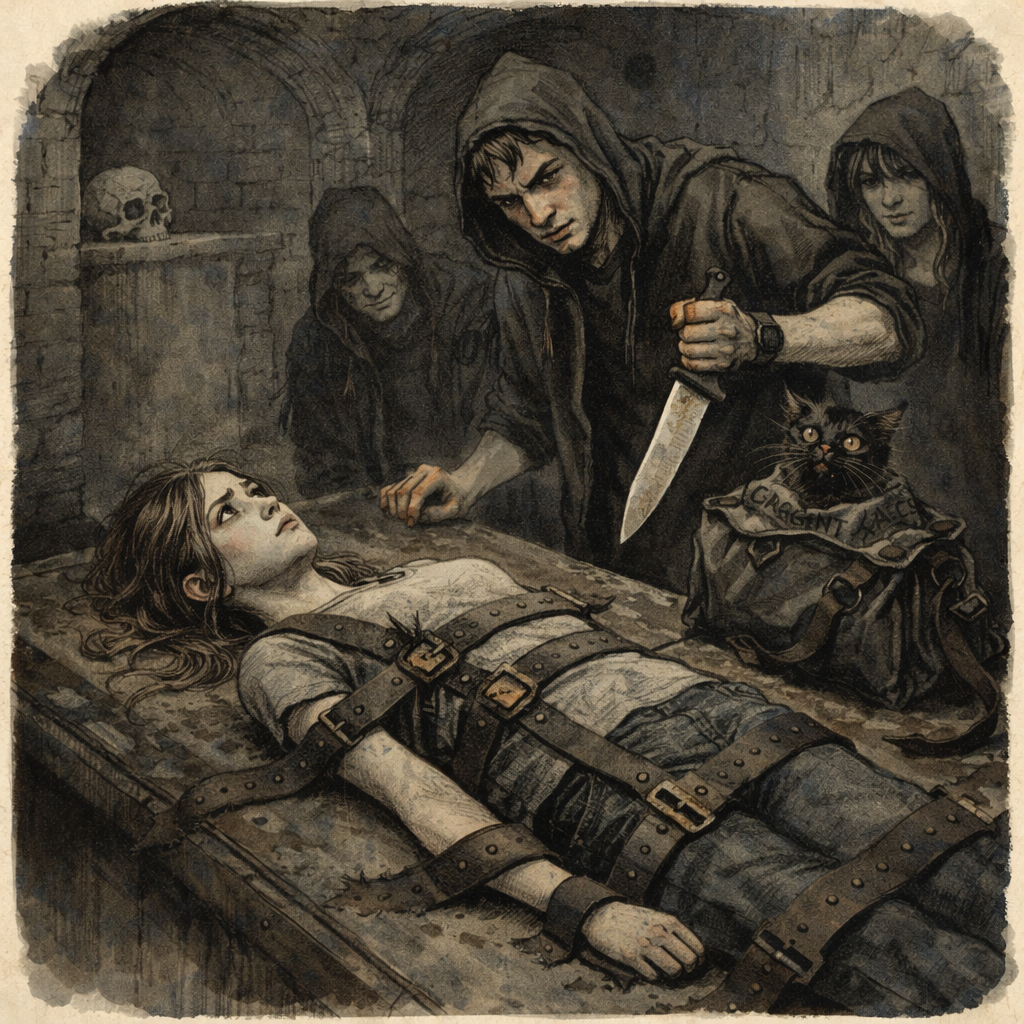 - Не надо, девочка, таким как я, отказывать! Мы берём, что хотим. Всегда! Думаешь, насиловать будем? Неет! Сама предложишь! Всем присутствующим! – Игорь наклонился к стоящей неподалёку сумке и извлёк из неё чёрного кота. В другой руке словно сам собой возник здоровенный кухонный нож. – Вот сейчас принесём жертву, скажем заклинание, и сработает покруче любого дурацкого приворота!