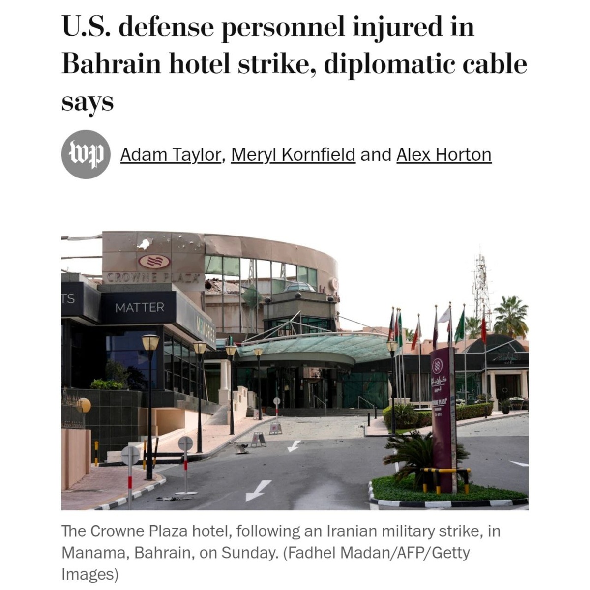 Вчера иранский дрон поразил отель Crowne Plaza в центре Манамы — столицы Бахрейна. Двое сотрудников Министерства обороны США получили ранения. Факт подтверждён служебной шифровкой Госдепа, с которой ознакомилась Washington Post. 🖍Отель Crowne Plaza расположен в районе, вплотную примыкающем к штабу 5-го флота ВМС США. Гостиницы этого района традиционно используются как место размещения американских дипломатов, военных подрядчиков и прикомандированных специалистов Пентагона. 🚩После удара посольство США немедленно выпустило официальное предупреждение: гражданам рекомендовано избегать отелей Манамы как потенциальных целей для новых атак. Бахрейнские власти подтвердили материальный ущерб зданию и зафиксировали попадания в ряд других жилых и административных строений в том же районе. 🏳️Несмотря на то, что многие объекты страдают от обломков или случайно попадают под огонь, новые факты указывают, что в данном конкретном случае удар по отелю в Манаме мог быть прицельным. 📌Иран последовате