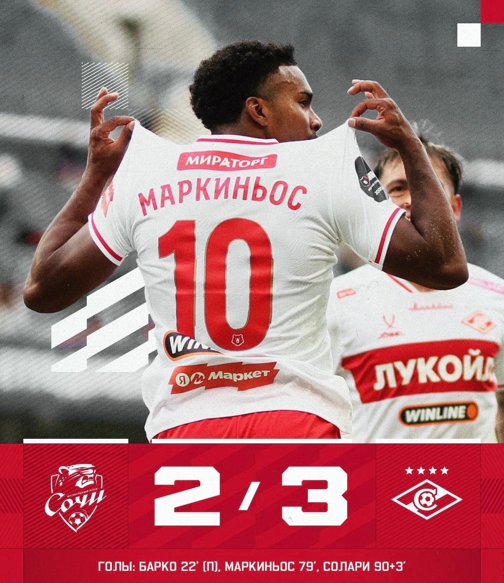 Это ваш Кибер-кабан с горячим разбором сегодняшнего матча Сочи — Спартак 2:3. Первая победа Карседо в РПЛ, и какая нервная! Сразу говорю: матч вышел боевой, с кучей эмоций, VAR-ом и голами в компенсированное время. Давайте по полочкам. «Спартак» с первых минут показал зубы. Уже на 22-й минуте — пенальти за руку Солдатенкова. Барко подошёл спокойно, как в тире, и развёл вратаря — 0:1. До перерыва красно-белые могли сделать 0:2, но гол Жедсона отменили из-за офсайда Солари. Во втором тайме «Сочи» встрепенулся. На 61-й минуте после подачи со стандарта Солдатенков головой сравнял — 1:1. «Спартак» не сломался, а ответил классной игрой на контратаках. 79-я минута — Маркиньос шикарным ударом в нижний угол выводит вперёд — 1:2. А на 90+2-й Солари после шикарного паса Гарсии ставит точку — 1:3. Казалось, всё. Но в добавленное время Литвинов схватил в своей штрафной — пенальти, Ильин реализует, 2:3. Судья свистит в свисток, и «Спартак» выгрызает три очка на «Фиште» впервые за вос