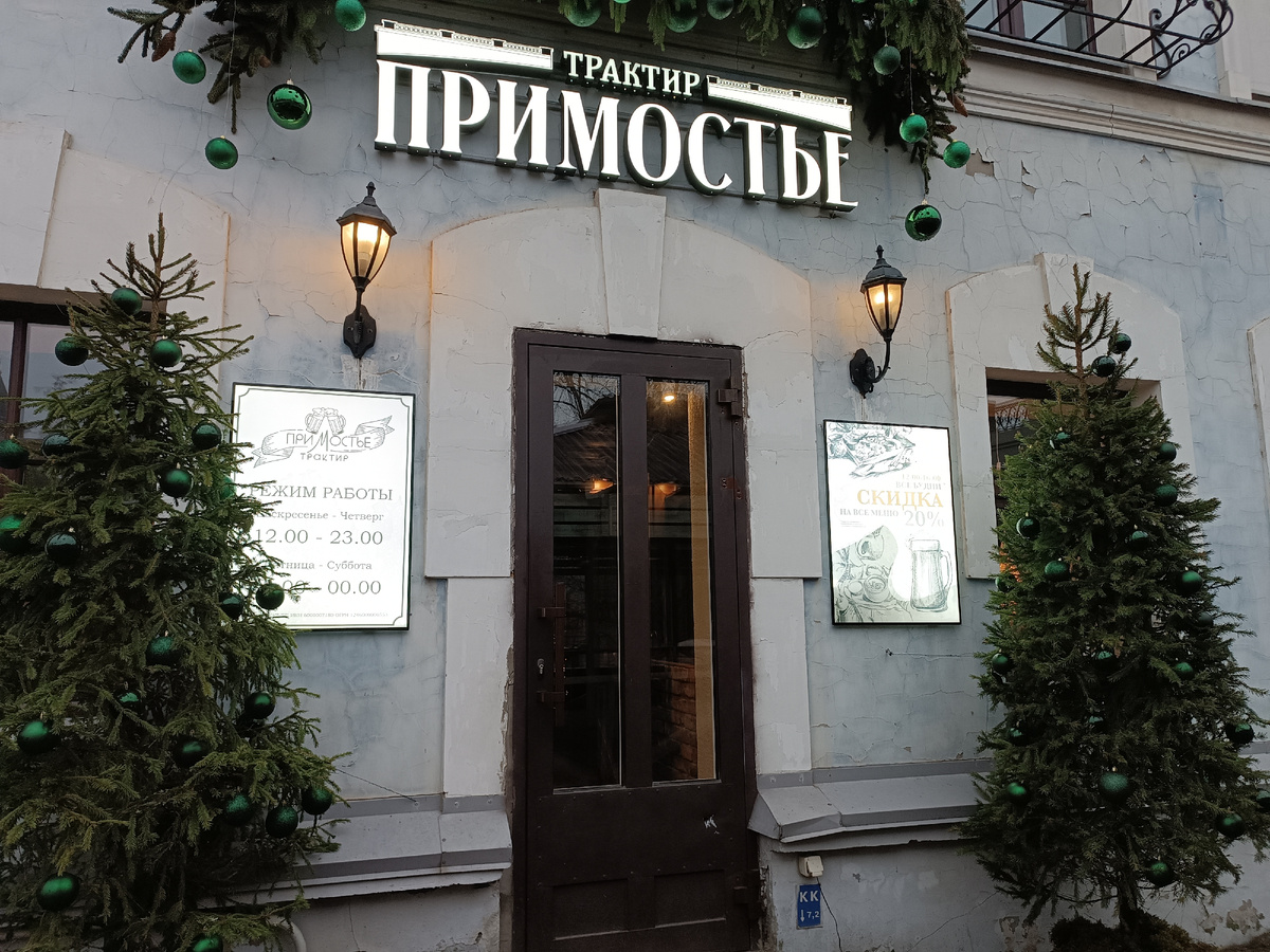1 декабря 2025 Гуляя по Пскову, мы решили, что ужинать пойдем в ресторан с русской кухней. Захотелось чего-то необычного и колоритного )) Высматривая на карте различные кафе и рестораны, выбор пал на трактир "Примостье". Расположен он по адресу: Советская набережная, д.2, рядом с Советским мостом. При входе висит табличка, на которой написано: 12:00-16:00 все будни скидка на все меню 20%. Это интересно )) Сегодня будний день, на часах 15:10. Привлекательное предложение )) Интерьер нам понравился, люблю такой стиль. И правда похоже на трактир )) Чувствуется приближение нового года )) Забавные надписи на стенах )) В туалетной комнате чисто и аккуратно. Мы присели за столик у окна, предвкушая, с каким удовольствием мы сейчас будем выбирать блюда ) Прогуливаясь по Пскову, аппетит мы хорошо нагуляли ) Меню внушительное, есть из чего выбрать! И все так вкусно звучит!!! Попробовать хотелось много всего, определиться было ох как не просто! Дима заказал скоблянку с говядиной (с картофелем, жаре