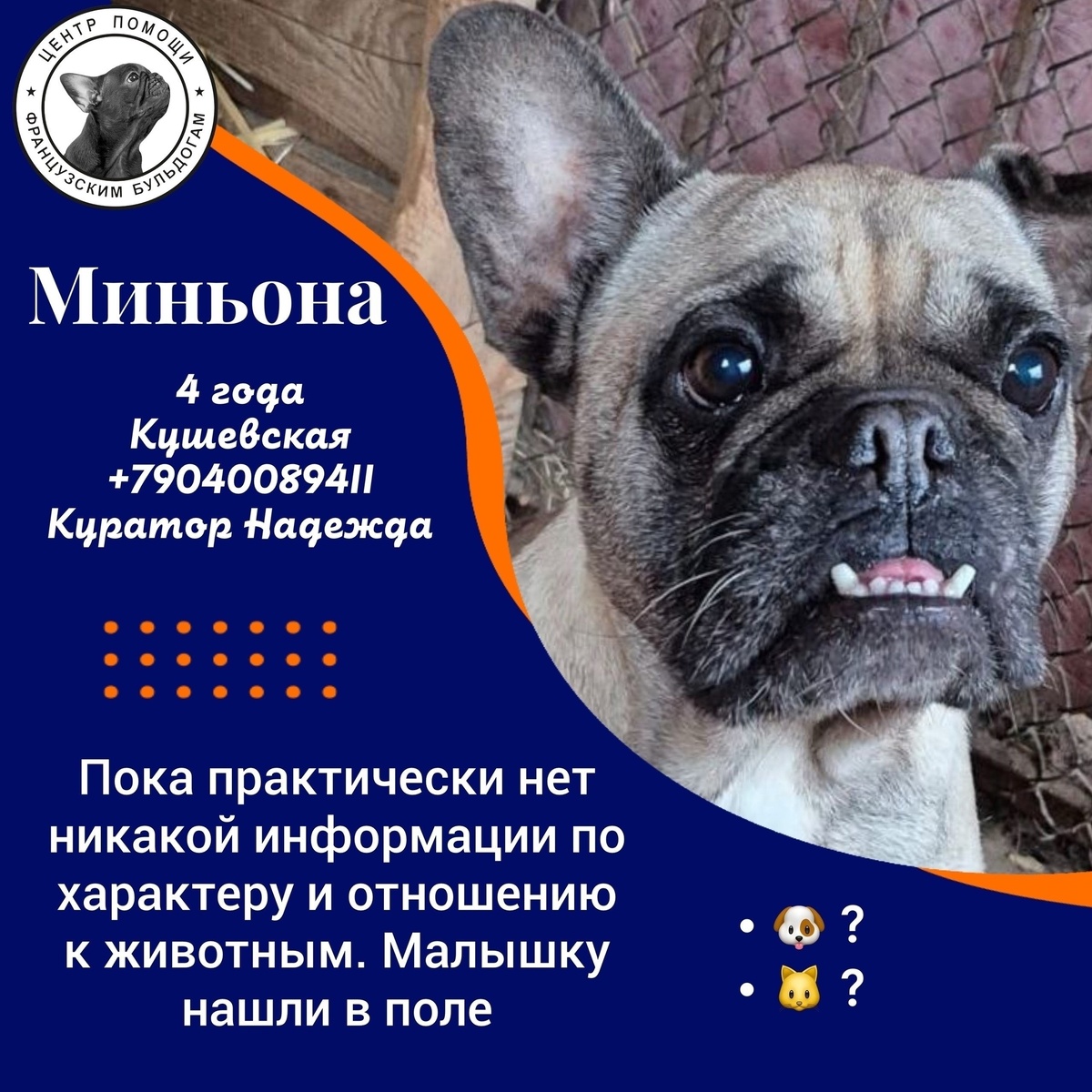 ! Чудесная девочка с очаровательной улыбкой так хочет домой!😍 #Миньона@frenchbull_help https://vk.ru/topic-144285450_55214786 Малышку нашли в поле в нашем Южном регионе. Обследовали, стерилизовали и сейчас она на передержке у нашей Марины Маринкиной в Кущевке ждёт - не дождется свою семью. Активная, любознательная, добрая. Как и любой бульдог обожает общество человека. А какие у нее забавные зубки - вы только посмотрите! Лояльна с собаками, к кошкам на улице проявляет интерес, поэтому однозначно сказать подружится ли она с вашей кошкой мы не можем. Очень хочется верить, что Миньона скоро станет домашней. Она с удовольствием будет лежать с вами на диванчике и смотреть фильмы и кушать вкусняшки. Заберите девочку домой🙌 Итак, алгоритм действий для будущих родителей: 1. Заполняйте анкету ✏️: vk.com/app5619682_-144285450 2. Списывайтесь САМОСТОЯТЕЛЬНО с куратором ➡️ 📌Куратор: 89040089411 Надежда ( пожалуйста, пишите на WhatsApp или ТГ, позже я обязательно отвечу)