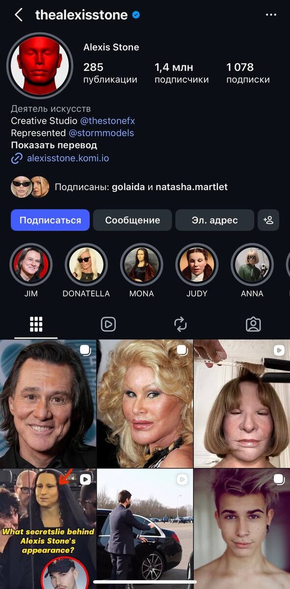 🤯 Весь интернет буквально сошел с ума и яростно спорит: а настоящий ли Джим вообще был на недавнем мероприятии в Париже? Люди разбирали фото и видео по пикселям, и гадали, что случилось с актером — неудачная пластика, старость или нас всех водят за нос иллюминаты? Известный британский мейкап-иллюзионист Alexis Stone, который частенько переодевается в селебрити, выложил пост о том, что это был он Если посмотреть на его профиль, кажется, это правда… Судя по его stories, чтобы провернуть эту аферу, Алексис использовал не просто тонну грима, а полноценную силиконовую маску, созданную по слепкам… …хотя, надо сказать, что фото в карусели явно сгенерировано ИИ Стоун уже проворачивал подобное, когда приходил на показы в образах Дженнифер Кулидж, Мадонны и миссис Даутфайр, но в этот раз пранк вышел на какой-то космический уровень Как вам кажется, похож? Сразу поняли, что на фото был подвох, или тоже до последнего верили, что это реальный Джим? А может быть верите до сих пор? Если это
