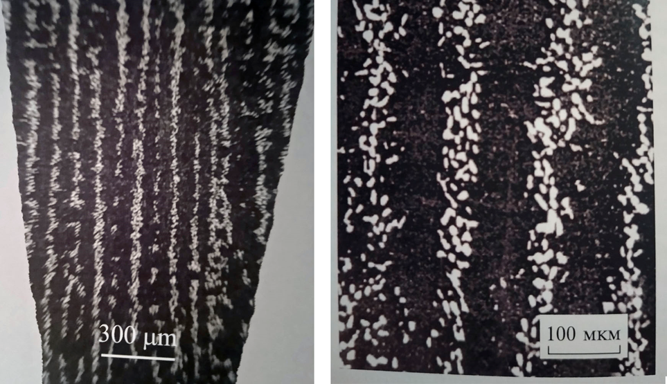 Известно, что в обычной стали структура накапливает до 10% энергии деформации в виде увеличения площади поверхностей зерна и карбидов вследствие их измельчения, а также искажений кристаллической структуры межзеренного пространства. Очевидно, что в узорчатых сталях эта доля намного выше.
