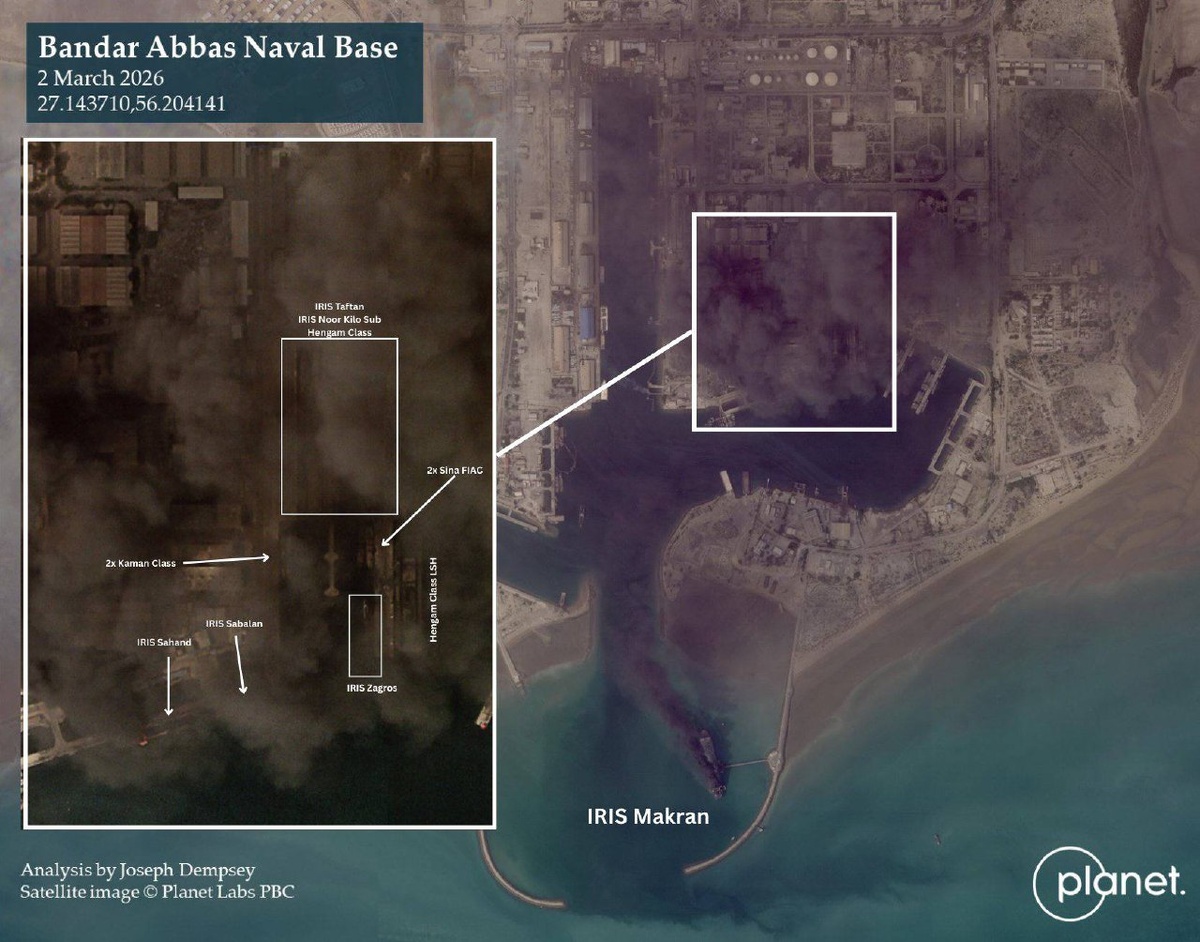 Анализ спутникового снимка военно-морской базы Бендер-Аббас, позволяющий получить представление о том, какие корабли находились в акватории базы в момент ракетного удара. ▪️Вероятно, три корабля были уничтожены: эсминец Sahand, фрегаты Sabalan и Zagros. ▪️Плавучая база Makran получила серьёзные повреждения. ▪️Четыре патрульных корабля класса Sina/Kaman. Их состояние неизвестно. ▪️В сухом доке находятся эсминец Taftan, подводная лодка Noor проекта «Палтус» и два УДК класса Hengam. Более точный анализ на данный момент затруднён в виду сильного задымления на территории базы. Отметим, что приказом от 21 ноября 2019 года штаб ВМС Ирана был перенесён из Тегерана в Бендер-Аббас. По словам командующего ВМС Хоссейна Ханжана, это решение было принято в связи с высокой угрозой на южных границах. Военный Осведомитель