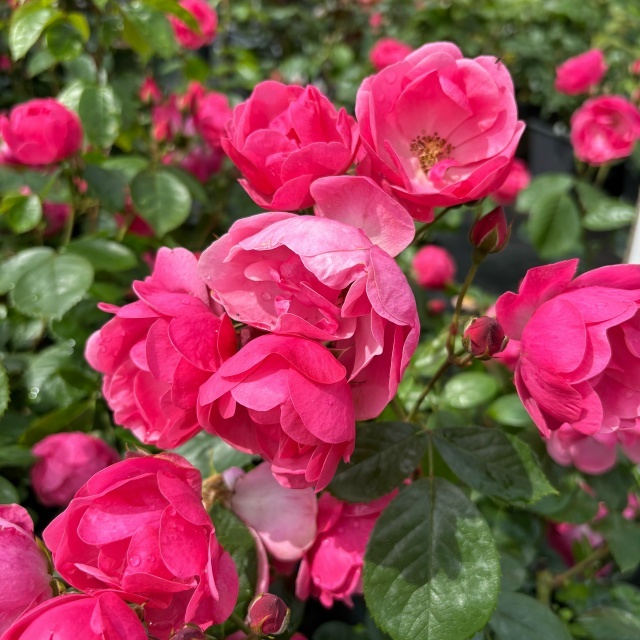 Роза Ангела (Angela) — одна из самых узнаваемых флорибунд немецкой селекции Kordes. Своей популярностью она обязана редкому сочетанию: бледно-розовые лепестки с ярким малиновым реверсом и глубокая чашевидная форма цветка, которая практически не встречается у других сортов этой группы. Цветки собраны в плотные большие соцветия — контраст между розовым центром и красной внешней стороной хорошо виден даже на расстоянии. Куст здоровый и густооблиственный. Листва тёмно-зелёная, блестящая. В условиях Ленинградской области Angela держится компактно — 100–150 см в высоту, не разваливается и не требует опоры. Как ведёт себя Ангела в нашем климате Мы выращиваем этот сорт в питомнике в Шепелево с 2019 года. За эти годы роза показала себя с лучшей стороны именно в северо-западном климате: влажное лето и частые дожди ей не страшны — цветки не пятнятся и не облетают при намокании. Зимует стабильно под лёгким укрытием из лапника и агроволокна. Начало цветения в наших условиях — как правило, вторая п