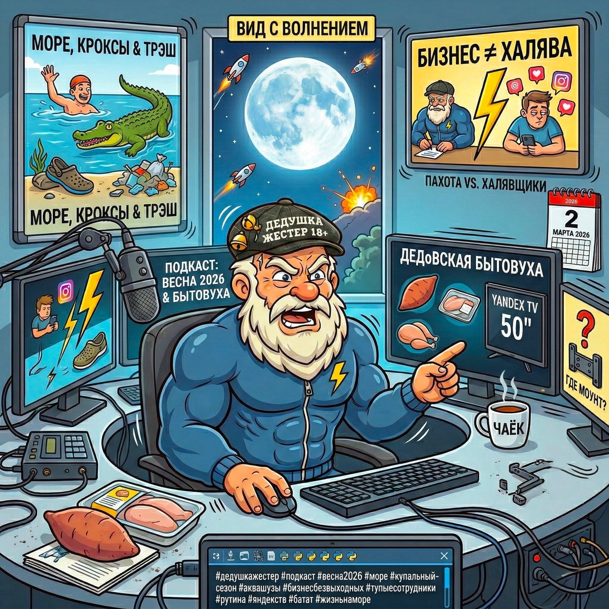 ! 🤬📺 Всем бобренького вечерочка, ребятушки! На календаре 2 марта 2026 года, дед нагулял свои 11 тысяч шагов и поймал реальное весеннее настроение под здоровенной полной луной! Правда, домик слегка потряхивает от грохота ракет и взрывов, но нам к этому не привыкать. 💥🚀 В сегодняшнем сочном подкастике: * Мечтаю о море и планирую заплывы. Жду, когда вода прогреется хотя бы до 10 градусов, чтобы кайфануть. Надо только купить настоящие запасные кроксы. 🌊🩴 * Ужасаюсь количеству мусора от отдыхающих, которые засирают планету своими потерянными резиновыми аквашузами! 🤬🗑️ * Жестко разношу тупых сотрудников и инста-халявщиков. Объясняю, почему сливаю нахуй рутину и как меня заебало работать за двоих, пока кто-то ждет зарплату просто так. Запомните: настоящий бизнес — это пахота без выходных, а не сидение на жопе ровно! 💼🔥 * Дедовская бытовуха: наконец-то раздобыл дефицитный батат и затарил свеженькой куриной грудки. А еще купил здоровенный 50-дюймовый телек Яндекс ТВ. Осталось тольк