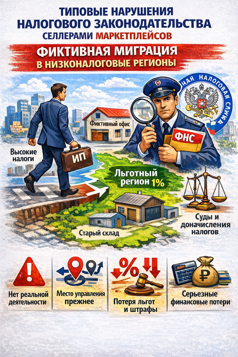 Фиктивная налоговая миграция — одна из самых материально рискованных стратегий для селлеров маркетплейсов. Законная смена региона возможна только при реальном переносе бизнеса: офис, сотрудники, управленческие решения, хозяйственная деятельность.
