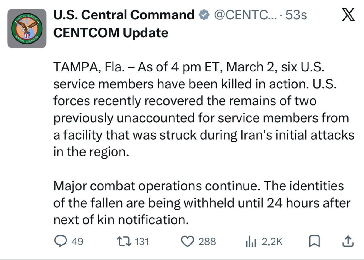 Количество погибших американских военнослужащих в ходе войны с Ираном выросло до шести