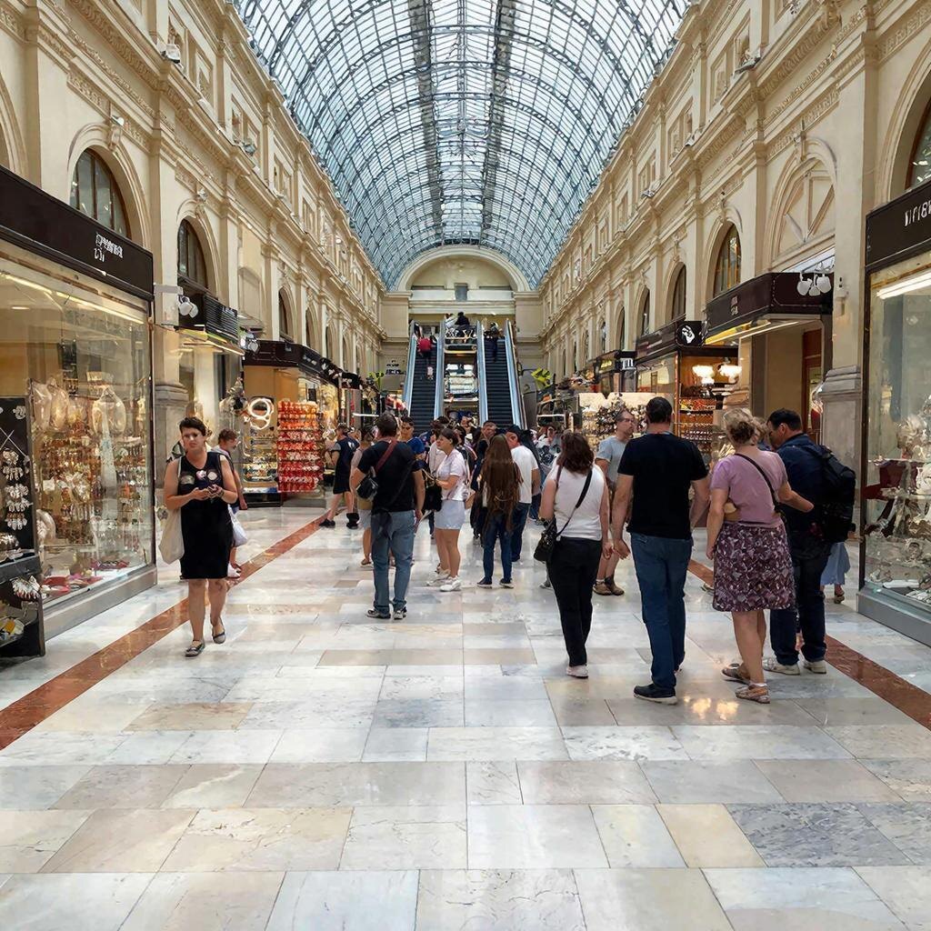 Три параллельных линии связаны воздушными переходами-мостиками, через стеклянный купол льётся дневной свет, а вечером весь фасад вспыхивает тысячами огней. Николай II и советские вожди ходили по этим галереям — здесь принималась первая реклама, написанная лично Владимиром Маяковским.