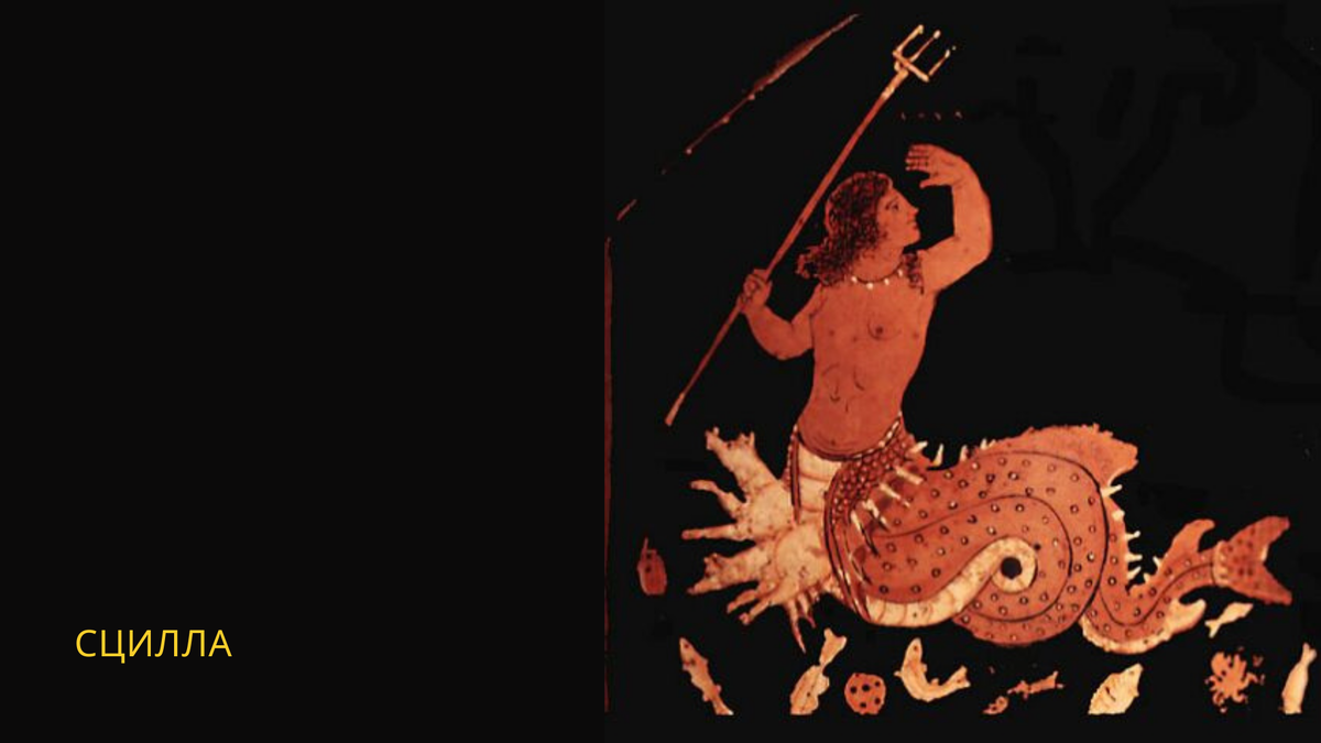 Монстры обитали на противоположных берегах пролива, а расстояние между ними равнялось полету стрелы. У Сциллы было шесть собачьих голов и двенадцать ног.