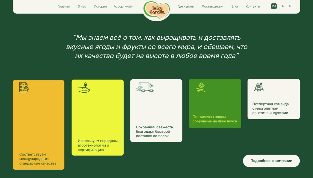 ✅Многостраничный сайт ✅Анимация ✅Перевод на 3 языка - Русский, Английский и Узбекский ✅СЕО продвижение ✅Помощь с выкупом занятого домена Около 3-х месяцев плотной работы, сейчас продолжаем работу по СЕО 👉 Ссылка на проект https://juicygarden.com/ #кейсы
