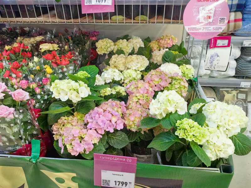 Вчера, как обычно, с утра побежала за продуктами - молоко, хлеб, что-то по мелочи - и, зайдя в наш местный сетевой супермаркет, обнаружила, что магазин уже вовсю готовится к 8-му марта. Выставили различные цветы цветущие, тут и крупнолистные гортензии, хотя цены я вам скажу не бюджетные совсем, даже в специализированных садовых магазинах можно найти дешевле Есть азалии Гиацинты цвет набрали, вот-вот зацветут, там ещё кактусята сбоку притаились Ну и конечно, розы Кордана. Красивые, все в цвету У меня когда-то была такая розочка, пару лет жила, летом я на балкон её выставляла, но дачи тогда у меня ещё не было. И в одну из зим, она что-то сильно заболела и погибла. Хотя знаю, многие у нас такие розочки высаживают на участках, и они неплохо растут и цветут, только, конечно, надо их очень хорошо укрывать. Ну и сладости: Рафаэлки стоят стройными рядами. А потом увидела стойки с азиатскими товарами и решила и их заснять, может вам интересно будет, чем у нас в магазинах торгуют, а там и