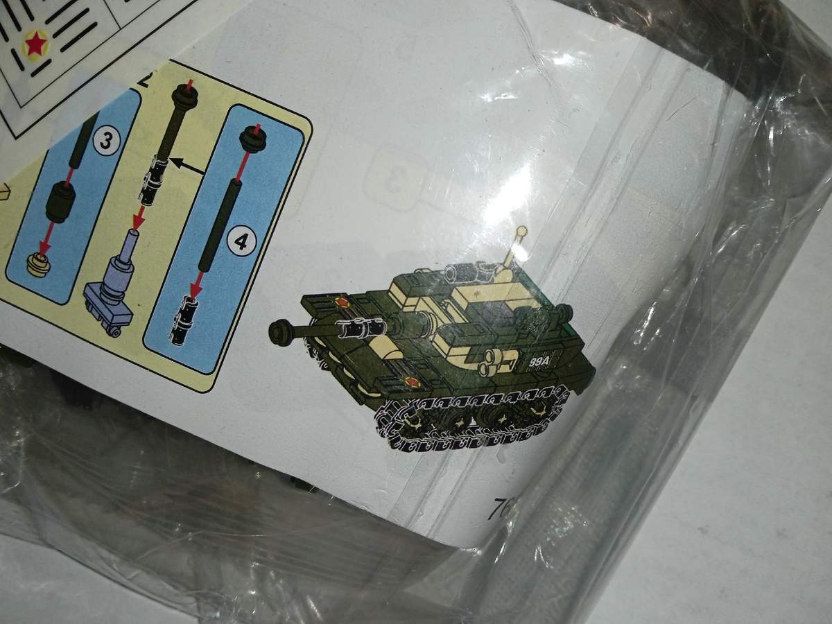 Привет всем! В этой статье я покажу, как собирал конструктор "Танк 99А". Этот танк-конструктор купили на "Алиэкспресс". На танк "99А" очень интересно было смотреть, и сразу возникло желание его собрать! Схема сборки понятная, собирать танк по ней нетрудно. Вот схема сборки с другой стороны. Номер модели - 7651! На схеме можно увидеть нарисованный танк в собранном виде. Детали были упакованы в запечатанные пакетики (их два). Детали не самые мелкие (не мини-блоки). А вот и второй пакетик деталей. В основном, они зелёного цвета. Первый пакетик высыпали в одно место, второй пакетик - в другое. Посмотрите на россыпь деталей, она большая и занимательная. Детали разной формы, некоторые кажутся немного сложными. Вот всё, что есть в наборе: два пакетика деталей конструктора, наклейки на танк "99А" и схема сборки! Схема кажется простой, хотя для начинающих она всё же сложновата. Итак, готовимся собирать танк. Вот я собираю первый пункт схемы. Вот сделан второй пункт из двенадцати. Посмотрим побл