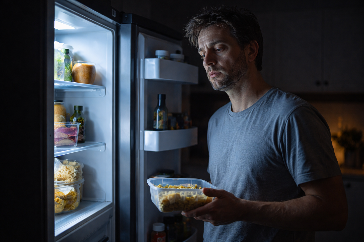 «Лень вставать». Третья мысль уже не мысль — а автопилот. Я иду на кухню. Темно. Тихо. Холодильник светится как портал в другую реальность.