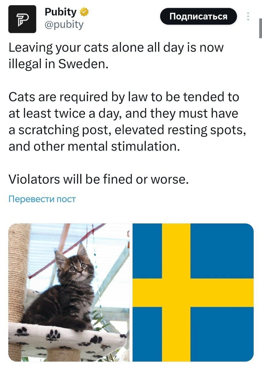 Нам бы их проблемы: В Швеции запретили оставлять котиков одних на весь день — правительство ужесточило правила ухода за питомцами. Теперь каждый хозяин обязан обустроить для котейки личное пространство с лежанкой и когтеточкой, а также играть с питомцем минимум дважды в день. В противном случае кот может впасть в депрессию, за что человеку грозит наказание вплоть до тюрьмы. Кстати, в Швеции многие районы уже не подчиняются властям страны. Имеется ввиду районы населенные мигрантами. Полиция не рискует туда заходить. Вопрос , там котиков тоже проверяют, или это касается только этнических шведов?