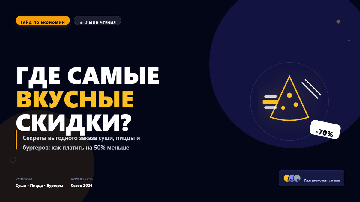 Сегодня рынок доставки перенасыщен, и рестораны ведут настоящую войну за каждого клиента. Для нас, потребителей, это отличная новость, ведь конкуренция порождает скидки на доставку еды, которые порой достигают 50-70%. В этой статье мы разберем, как и где заказать еду со скидкой, как использовать промокоды на доставку еды и на что обратить внимание, чтобы ваш обед был не только вкусным, но и максимально бюджетным.