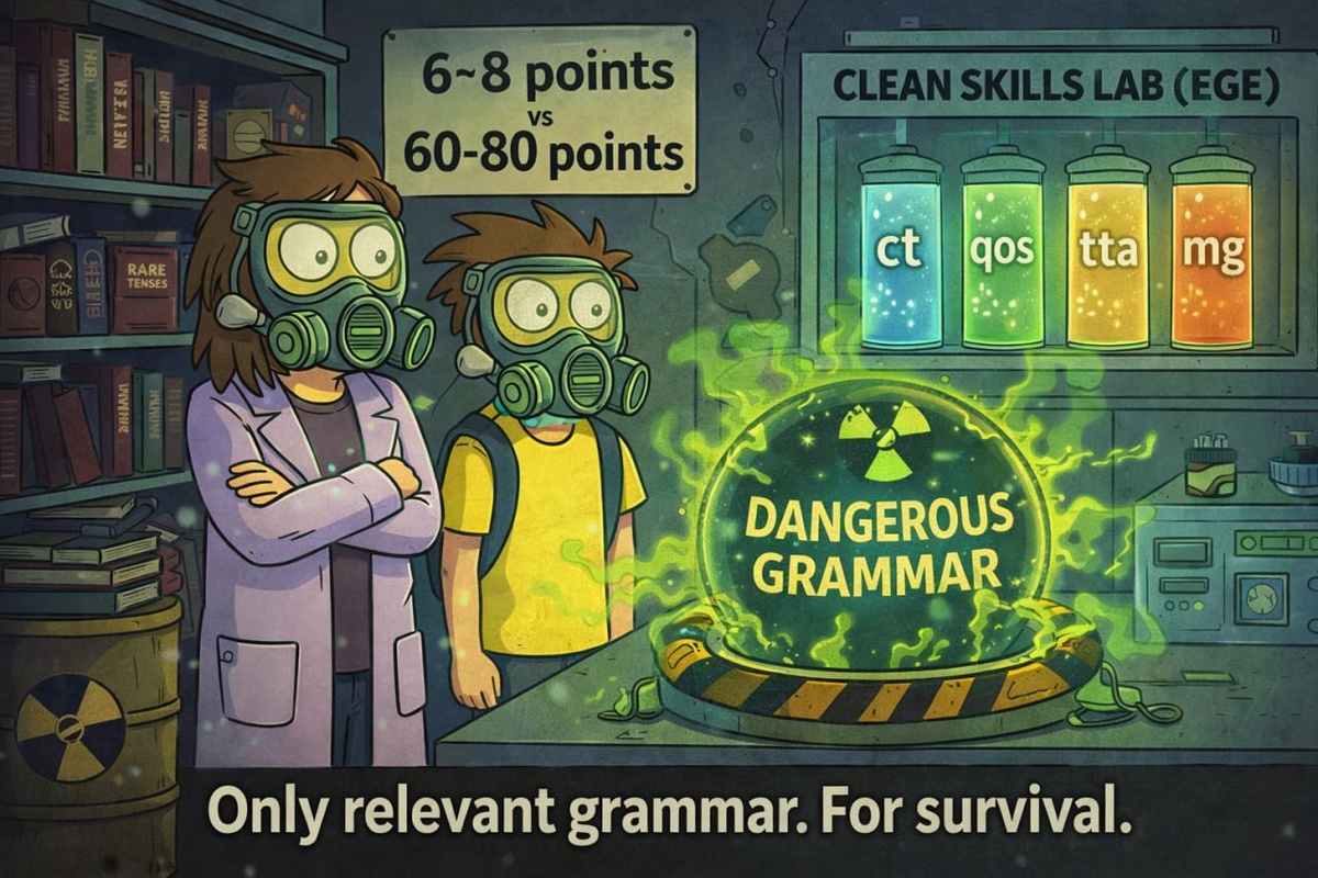 Как-то меня спросили «А вся ли грамматика из кодификатора входит в ваше пособие?» Короткий ответ — конечно, нет. Если попытаться “впихнуть всю грамматику” в одно пособие, получится не учебник, а энциклопедия, которую страшно открывать. И давайте честно: если преподавать вообще всё подряд, можно не только устать — можно просто умереть в процессе. И ученик тоже. Особенно если у него впереди экзамен, а не олимпиада по теории языка. Пособие по грамматике для экзамена — это не “всё, что существует в английском”. Это то, что реально даёт баллы и реально встречается в заданиях. Под “всей грамматикой” обычно подразумевают бесконечный список тем: десятки оттенков времён, исключения, тонкости согласования, редкие конструкции, спорные случаи, которые даже взрослые носители языка обходят стороной. Проблема в том, что 80% этих тем не дают экзаменационного эффекта. Они могут быть интересны, но они не решают главную задачу: быстро и стабильно поднять результат. Экзамен проверяет не широту “грам